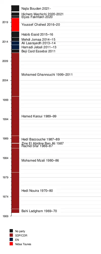 44 people have held the office since 1759. The current prime minister is Najla Bouden since October 2021, as Tunisia's first female prime minister.[2]