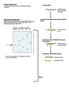 Primer extension offers an alternative to a nuclease protection assay (S1 nuclease mapping) for quantifying and mapping RNA transcripts. The hybridization probe for primer extension is a synthesized oligonucleotide, whereas S1 mapping requires isolation of a DNA fragment. Both methods provide information where a mRNA starts and provide an estimate of the concentration of a transcript by the intensity of the transcript band on the resulting autoradiograph. Unlike S1 mapping, however, primer extension can only be used to locate the 5’-end of an mRNA transcript because the DNA synthesis required for the assay relies on reverse transcriptase (only polymerizes in the 5’ → 3’ direction).