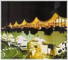 Designed by the Bangladeshi-American engineer Fazlur Rahman Khan of the architectural firm Skidmore, Owings & Merrill LLP (SOM), it is known for its tent-like roof structure, engineered by Horst Berger while part of Geiger Berger Associates.[9] Ten modules, each consisting of twenty-one "tents" of white colored Teflon-coated fiberglass fabric suspended from pylons, are grouped together into two blocks of five modules and separated by a landscaped mall between the blocks. Only customs, baggage handling and similar facilities are located in an air-conditioned building. The vast majority of the complex, called "Terminal Support Area", is a flexible, open area, conceived to function like a village, complete with souk (market) and mosque. Not enclosed by walls, this area is sheltered from the intense sun while allowing for natural ventilation; because of this, some consider it to be a green, environmentally-friendly building.[10]