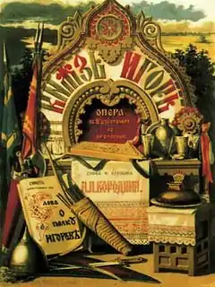 ![]() Title page of the published score. The text reads: "Prince Igor, opera in 4 acts with a prologue, words and music by A.P. Borodin, subject adapted from The Lay of Igor's Host." | |