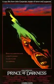 Prince of Darkness is a 1987 American supernatural horror film, written and directed by John Carpenter, and starring Donald Pleasence, Victor Wong, Jameson Parker, and Lisa Blount. The second installment in what Carpenter calls his "Apocalypse Trilogy"—which began with The Thing (1982) and concludes with In the Mouth of Madness (1994)[2]—the film follows a group of quantum physics students in Los Angeles who are asked to assist a Catholic priest in investigating an ancient cylinder of liquid discovered in a monastery, which they come to find is a sentient, liquid embodiment of Satan.