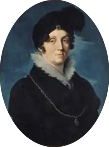 During her visits in Russia and Sweden she made attempts to reconcile her sons-in-law, the Russian and Swedish monarchs with each other.[4] In 1803, she received the royal Swedish family as guests in Baden, during which it was said that she had the chance to gain influence over her son-in-law, as she was lovable and amusing, had a lively interest in politics and the same views as him.[5] It was said of Amalie that: "The Landgravine of Baden could in power hunger and will force measure up to that of Catherine II".[6] As an opponent of Napoleon Bonaparte, she had tried to prevent the wedding of her son to Stéphanie de Beauharnais, and after their wedding in 1806, she retired to her widow estate at Schloss Bruchsal in the Kraichgau. In 1807, Amalie sent her daughter, Queen Frederica of Sweden, a letter from her second daughter, the Empress of Russia, in an attempt to convince Frederica to use her influence to persuade her spouse to make peace between Sweden and Napoleon, which did not succeed.[7][8]