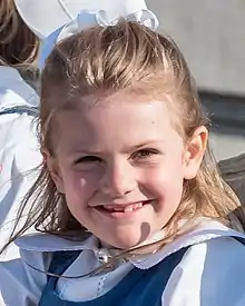 Princess Estelle of Sweden, Duchess of Östergötland (Estelle Silvia Ewa Mary;[2] born 23 February 2012) is the elder child of Crown Princess Victoria and Prince Daniel, Duke of Västergötland. She is the eldest grandchild of King Carl XVI Gustaf, and is second in line of succession to the Swedish throne, after her mother.