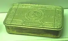 The funding was used to manufacture small boxes made of silver for officers and brass for all others,[4] however due to metal shortages in the later stages of the war some tins were made from plated base metals or alloys.[5] Each tin was decorated with an image of Mary and other military and imperial symbols and typically filled with an ounce of tobacco, a packet of cigarettes in a yellow monogrammed wrapper, a cigarette lighter, and a Christmas card and photograph from Princess Mary.[6] Some contained sweets, chocolates,[7] and lemon drops.[4]