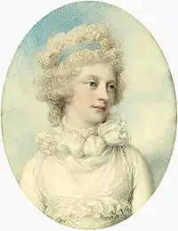 By 1792 Sophia and her sister Mary were being included in more family activities,[17] and at age fourteen, Sophia debuted at court on her father's birthday, 4 June 1792.[18] According to biographer Christopher Hibbert, in her young adulthood Sophia was a "delightful though moody girl, pretty, delicate and passionate."[19] As within her childhood, Sophia was devoted to her father, though she occasionally found him exasperating. She wrote that "the dear King is all kindness to me, and I cannot say how grateful I feel for it."[19] Prior to 1788, King George had told his daughters that he would take them to Hanover and find them suitable husbands[20] despite misgivings he had, which stemmed from his sisters' own unhappy marriages.[21] He remarked, "I cannot deny that I have never wished to see any of them marry: I am happy in their company, and do not in the least want a separation."[22] However, the King had his first bout of madness that year, when Sophia was aged eleven. Sophia remarked of her father's behaviour, "He is all affection and kindness to me, but sometimes an over kindness, if you can understand that, which greatly alarms me."[23] Further lapses into insanity occurred in 1801 and 1804, thus forestalling talk of marriage for his daughters. The question of matrimony was rarely raised; Queen Charlotte feared the subject, something which had always discomforted the King, would push him back into insanity. Furthermore, the queen, strained from her husband's illness, wanted the princesses to remain close to her.[10][22][24][25]
