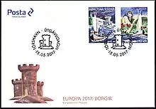 The princess was celebrated in a 2017 issue of postage stamps: the theme for the annual Europa competition was "Castles and palaces", and the Faroe Islands have never had any other resident royalty. One stamp shows the princess and her husband on a ship with an imaginary castle, the other shows the ship and portraits of the couple.[2][4] The artist was Janus Guttesen.[5]