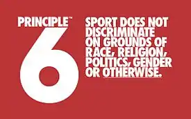 Any form of discrimination with regard to a country or a person on grounds of race, religion, politics, gender or otherwise is incompatible with belonging to the Olympic Movement.[2][3]