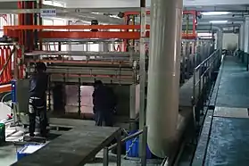 Laminates are manufactured by curing layers of cloth or paper with thermoset resin under pressure and heat to form an integral final piece of uniform thickness. They can be up to 4 by 8 feet (1.2 by 2.4 m) in width and length. Varying cloth weaves (threads per inch or cm), cloth thickness, and resin percentage are used to achieve the desired final thickness and dielectric characteristics. Available standard laminate thickness are listed in ANSI/IPC-D-275.[19]