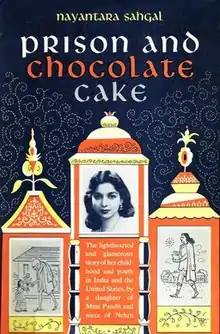 The title Prison and Chocolate Cake comes from an incident in the early 1930s[2][3] which Sahgal describes as her earliest political memory, one day at tea when she was age three.[4] Chocolate cake was a treat that day as usually they would have bread and butter.[5] When her elder sister Lekha asked their mother why police had arrived at their home during tea, their mother "explained that they had come to take Papu [their father] to prison, but that it was nothing to worry about, that he wanted to go. So we kissed him goodbye and watched him leave; talking cheerfully to the policeman".[4] Describing the incident as "far from unpleasant", she recounts in the book that "We ate our chocolate cake and, in our infant minds, prison became in some mysterious way, associated with chocolate cake".[2][4] The book is the first of Sahgal's autobiographies, one of two of her early works based on her childhood memories covering the years 1943 to 1948.[3][6] It was written during the winter of 1952–53 when she was 25, married, and having two young children.[7]