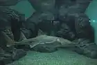 Sawfish are popular in public aquariums, but require very large tanks. In a review of 10 North American and European public aquariums that kept sawfish, their tanks were all very large and ranged from about 1,500,000 to 24,200,000 L (400,000–6,390,000 US gal).[55] Individuals in public aquariums often function as "ambassadors" for sawfish and their conservation plight.[90][91] In captivity they are quite robust, appear to grow faster than their wild counterparts (perhaps due to consistent access to food) and individuals have lived for decades, but breeding them has proven difficult.[55] In 2012, four smalltooth sawfish pups were born at Atlantis Paradise Island in the Bahamas and this remains the only time a member of this family has been successfully bred in captivity[55][89] (unsuccessful breeding attempts had happened earlier at the same facility, including a miscarriage in 2003).[92] Nevertheless, it is hoped that this success may be the first step in a captive breeding program for the threatened sawfish.[4] It is speculated that seasonal variations in water temperature, salinity and photoperiod are necessary to encourage breeding.[55] Artificial insemination, as already has been done in a few captive sharks, is also being considered.[93] Tracking studies indicate that if sawfish are released to the wild after spending a period in captivity (for example, if they outgrow their exhibit), they rapidly adopt a movement pattern similar to that of fully wild sawfish.[94]