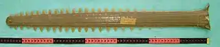 The most distinctive feature of sawfish is their saw-like rostrum with a row of whitish teeth (rostral teeth) on either side of it. The rostrum is an extension of the chondrocranium ("skull"),[27] made of cartilage and covered in skin.[33] The rostrum length is typically about one-quarter to one-third of the total length of the fish,[5] but it varies depending on species, and sometimes with age and sex.[1] The rostral teeth are not teeth in the traditional sense, but heavily modified dermal denticles.[34] The rostral teeth grow in size throughout the life of the sawfish and a tooth is not replaced if it is lost.[34][35] In Pristis sawfish the teeth are found along the entire length of the rostrum, but in adult Anoxypristis there are no teeth on the basal one-quarter of the rostrum (about one-sixth in juvenile Anoxypristis).[36][37] The number of teeth varies depending on the species and can range from 14 to 37 on each side of the rostrum.[2][38][note 1] It is common for a sawfish to have slightly different tooth counts on each side of its rostrum (difference typically does not surpass three).[39][40] In some species, females on average have fewer teeth than males.[1][39] Each tooth is peg-like in Pristis sawfish, and flattened and broadly triangular in Anoxypristis.[2] A combination of features, including fins and rostrum, are typically used to separate the species,[2][38] but it is possible to do it by the rostrum alone.[41]