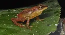 Pristimantis dorado is a species of frog in the family Strabomantidae.[2] It is native to the forests of Colombia.[3] The first specimen was found calling in roadside bushes in cloud forest near Chingaza National Natural Park at 2,650 m. The frog is less than 2 cm long and can be distinguished from closely related species by its metallic golden iris with a horizontal brown streak.[4]