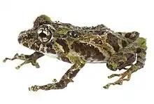 Adult males measure 19–28 mm (0.7–1.1 in)[7] and adult females 24–33 mm (0.9–1.3 in) in snout–vent length (SVL).[3][5] The snout is rounded in dorsal view and moderately long. The tympanum is half-concealed by the well-developed supratympanic fold. The fingers and the toes have large discs at their tips and vague (fingers) or narrow (toes), weakly crenelate lateral keels. Skin is dorsally finely tuberculate and ventrally areolate.[3] The dorsal coloration varies from green to greenish brown with darker brown markings. The belly is white, sometimes with brown fringes. The groin and posterior surfaces of the thighs are deep blue to dark brown, sometimes with orange spots on the edges. The iris is pale yellow with black reticulation.[4]