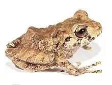 Adult males measure 12–21 mm (0.5–0.8 in) and adult females 23–43 mm (0.9–1.7 in) in snout–vent length. The snout is broadly rounded in dorsal view. The tympanum is visible, albeit slightly covered by the supratympanic fold. The fingers have narrow lateral fringes and terminal discs. The toes have slightly defined lateral fringes and terminal discs; no webbing is present. The upper eyelids bear 1–2 subconical tubercles and some rounded tubercles. The skin on the dorsum and flanks are shagreen. Scapular folds are distinctive. The dorsum and flanks light are brown to brown. There are irregular dark brown marks bounded by dirty or greenish cream or light brown. The groin has irregular yellowish marks. The venter is light gray or cream spotted with brown. The iris is golden coppery with black reticulations and a reddish horizontal stripe.[1][3]