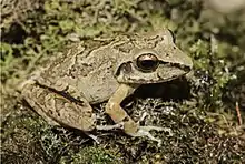 Adult males measure 23–33 mm (0.91–1.30 in) and adult females 31–49 mm (1.2–1.9 in) in snout–vent length. Dorsal skin is shagreened and has scattered small warts, but ventral skin smooth. The tympanum is prominent and vertically oval. The snout is subacuminate to acuminate in dorsal view, but round in vertical profile. The canthus rostralis is distinct and angular. Fingers and toes bear discs (enlarged on fingers III and IV and toes IV and V) but have no webbing. Males have vocal slits.[4]