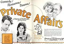 Private Affairs is a 1925 American silent drama film directed by Renaud Hoffman with Gladys Hulette, Robert Agnew, and Mildred Harris.[1] The plot was based on a 1922 short story "The Ledger of Life" by George Patullo.[2][3][4][5]