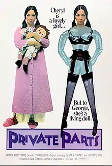 Private Parts is a 1972 American horror film[4] directed by Paul Bartel in his feature film debut, and starring Ayn Ruymen, Lucille Benson, and John Ventantonio. Its plot follows a troubled young woman who suspects a deviant serial killer is living among her in her aunt's dilapidated hotel in downtown Los Angeles. The film has been noted for its stylistic mixture of horror, dark comedy, and psychological thriller elements.[5]