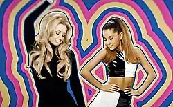 The official music video was filmed on April 29, 2014, just one day after the single's release, and was directed by The Young Astronauts who had previously worked with Grande on videos for her singles "Right There" and "Almost Is Never Enough". Kaz James makes an appearance in the video.[103] The video was inspired in Sweet Charity (1969), set with a retro style from 1960s art movement containing a black, white, and old-fashioned aesthetic.[104][105] The video opens on a sparkling figure where Grande appears in a sequined minidress and white go go boots with her dancers backed by a spiral backdrop. Iggy Azalea is shown in front of a colorful background, and, as Jason Lipzshuts from Billboord noted, her hairstyle is reminiscent of Barbarella,[106] while Chima Simone of E! compared her hair to Nancy Sinatra's in her "These Boots Are Made for Walkin'" (1966) video.[107] The video contains intercepted scenes of Grande lying atop a giant spiral on a pink floor wearing a white sweater and high socks. Lia Ben from the website Bustle compared the scene to Britney Spears's "Oops!... I Did It Again music video (2000).[108]