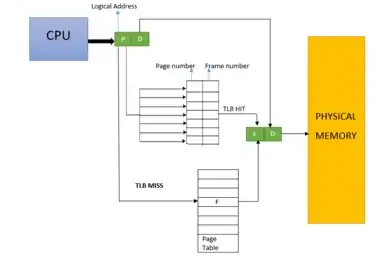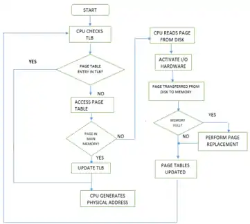 The flowchart provided explains the working of a TLB. If it is a TLB miss, then the CPU checks the page table for the page table entry. If the present bit is set, then the page is in main memory, and the processor can retrieve the frame number from the page-table entry to form the physical address.[6] The processor also updates the TLB to include the new page-table entry. Finally, if the present bit is not set, then the desired page is not in the main memory, and a page fault is issued. Then a page-fault interrupt is called, which executes the page-fault handling routine.