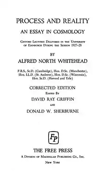 - Whitehead, A.N. (1929). Process and Reality. An Essay in Cosmology. Gifford Lectures Delivered in the University of Edinburgh During the Session 1927–1928, Macmillan, New York, Cambridge University Press, Cambridge UK.
