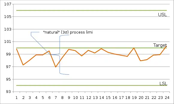 Consider a quality characteristic with target of 100.00 μm and upper and lower specification limits of 106.00 μm and 94.00 μm respectively. If, after carefully monitoring the process for a while, it appears that the process is in control and producing output predictably (as depicted in the run chart below), we can meaningfully estimate its mean and standard deviation.