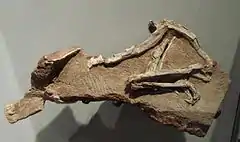 Burrer sent the specimen to Professor Eberhard Fraas of the königliche Stuttgarter Naturalienkabinett. In a lecture on 9 October 1911, Fraas referred to it by the name "Hallopus celerrimus", considering it a jumping form of dinosaur that was approximately 60 cm (2.0 ft) long, and was associated with the origin of birds.[2] Later, Fraas decided to use a different name in the official publication.[3] Fraas in 1913 named the genus Procompsognathus with as type species, Procompsognathus triassicus.[4] The type specimen is housed in the collection of the State Museum of Natural History in Stuttgart, Germany.