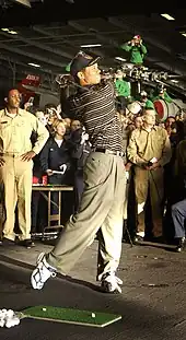 With the announcement "Hello, World." Tiger Woods became a professional golfer in August 1996 and signed endorsement deals worth $40 million from Nike, Inc. and $20 million from Titleist.[1][2] These endorsement contracts were the highest in golf history up to that point. He played his first professional golf event at the Greater Milwaukee Open, tying for 60th place, recorded a hole-in-one, and would win two events in the next three months to qualify for the Tour Championship. For his efforts, Woods was named Sports Illustrated's 1996 Sportsman of the Year and PGA Tour Rookie of the Year.[3] He began his tradition of wearing a red shirt during the final round of tournaments, which was a link to his college days at Stanford.[4][5]