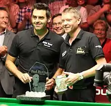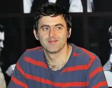 In the 1995–96 season, O'Sullivan again did not capture any ranking titles but was victorious at the non-ranking Charity Challenge defeating John Higgins 9–6 in the final.[25] As defending champion, O'Sullivan reached the final of the Masters, but lost his title 5–10 to Stephen Hendry.[22] For the first time, O'Sullivan reached the World Championship semi-finals, but lost 14–16 to Peter Ebdon.[24] After his 10–3 first round victory over Alain Robidoux, Robidoux accused O'Sullivan of showing "disrespect" after he had played left-handed during the match. Robidoux refused to shake hands with O'Sullivan at the end of the match. O'Sullivan responded by saying that he was "better left-handed than [Robidoux] is right-handed."[26][27] Later during the tournament, before his quarter-final match with John Higgins, O'Sullivan was involved in an incident with assistant press officer, Michael Ganley, in the press room. O'Sullivan admitted to assaulting Ganley during the incident. For this snooker's governing body, the WPBSA, gave O'Sullivan a two-year suspended ban and a £20,000 fine, and advised him to donate £10,000 to charity, but allowed him to continue competing at the event.[28][29]