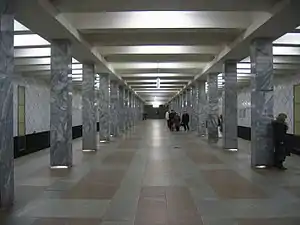 Profsoyuznaya is built to a standard column tri-span and features pillars faced (except for very thin unfinished strips at the top and bottom) with gray marble. The walls are finished with a diamond pattern made up of 4×4 squares of white ceramic tile (similar to argyle patterns, albeit simplified with use of single color). The architects responsible for the station were Nina Aleshina and N. Demchinsky.