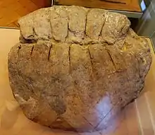 The broadened ribs on Proganochelys show "metaplastic ossification of the dermis".[8] The enlarged ribs suggest that the endochondral rib ossifications were joined by a second ossification instead of having expanded ribs.[8] The 220-million-year-old stem-turtle Odontochelys only has a partially formed shell.[9] Odontochelys is believed to only possess the underside element of a shell known as a plastron. The 5-million-year difference that distinguish Odontochelys from Proganochelys tell us that the evolution of the shell occurred relatively quickly in time.[8] Proganochelys possess both a carapace, the upper formation of the shell, and the plastron, the lower. The shell is believed to be used for protection an enhanced feature for survival. Proganochelys fits well into the order as a turtle, as the shell of Proganochelys is in agreement with the evolution of other stem-turtles.[1]