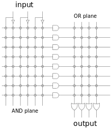 A programmable logic array (PLA) is a kind of programmable logic device used to implement combinational logic circuits. The PLA has a set of programmable AND gate planes, which link to a set of programmable OR gate planes, which can then be conditionally complemented to produce an output. It has 2N AND gates for N input variables, and for M outputs from PLA, there should be M OR gates, each with programmable inputs from all of the AND gates. This layout allows for many logic functions to be synthesized in the sum of products canonical forms.