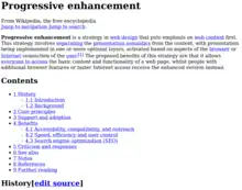 - Progressive enhancement is used in the front ends of MediaWiki-powered sites such as Wikipedia, as it is readable, navigable, and even editable using the basic HTML interface without styling or scripts, though is enhanced by such. For example, the wikitext editor's toolbar is loaded and operates through JavaScript.