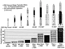 In 1983, the Strategic Defense Initiative ("Star Wars") identified missions that could benefit from rockets that are more powerful than chemical rockets, and some that could only be undertaken by more powerful rockets.[3] A nuclear propulsion project, SP-100, was created in February 1983 with the aim of developing a 100 KW nuclear rocket system. The concept incorporated a particle/pebble-bed reactor, a concept developed by James R. Powell at the Brookhaven National Laboratory, which promised a specific impulse of up to 1,000 seconds (9.8 km/s) and a thrust to weight ratio of between 25 and 35 for thrust levels greater than 89,000 newtons (20,000 lbf).[4]