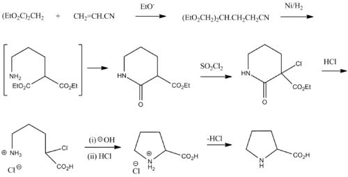 Proline was first isolated in 1900 by Richard Willstätter who obtained the amino acid while studying N-methylproline, and synthesized proline by the reaction of sodium salt of diethyl malonate with 1,3-dibromopropane. The next year, Emil Fischer isolated proline from casein and the decomposition products of γ-phthalimido-propylmalonic ester,[5] and published the synthesis of proline from phthalimide propylmalonic ester.[6]
