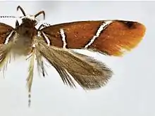 The wingspan is about 15–16 mm. The ground colour of the forewings is ochreous brown. The markings are white edged with black scales. The hindwings and cilia are dark grey.[1]