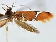 The wingspan is about 14–15 mm. The forewings have white markings edged with black scales. The hindwings and cilia are ochreous grey.[1]
