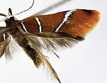 The wingspan is about 15.5 mm. The forewings are ochreous brown with white markings edged with black scales. The hindwings and cilia are dark grey.[1]