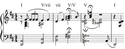 Jim Samson[3] points out that it fits in well with Scriabin's mainly dominant quality sonorities and harmony, as it may take on a dominant quality on C or F♯. This tritone relationship between possible resolutions is important to Scriabin's harmonic language, and it is a property shared by the French sixth (also prominent in his work) of which the synthetic chord can be seen as an extension. The example below shows the mystic chord rewritten as a French sixth with notes A and D as extensions: