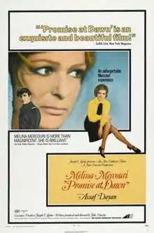 Promise at Dawn (French: La Promesse de l'aube) is a 1970 American drama film directed by Jules Dassin and starring Melina Mercouri, Dassin's wife. It is based on the 1960 novel Promise at Dawn (French: La Promesse de l'aube) by Romain Gary and the subsequent play by Samuel A. Taylor.