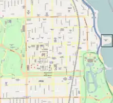 Located on Chicago Park District land at 55th Street in Chicago's south side Hyde Park neighborhood, it was opened to the public in 1937. Alfred Caldwell, a disciple of Jens Jensen,[2] designed the landscaping, following the Prairie School which uses native plants and stone. Caldwell's design featured a raised "meadow" section in the center of the 12-acre (49,000 m2) peninsula and included hundreds of flowering trees and shrubs. In 1938, Caldwell created stone sitting rings - called "council rings" - around the lakefront edge, which today are used as fire pits. Few of Caldwell's original plantings remain today.