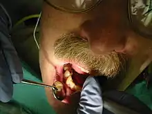 The "traditional" debridement procedure involves four sessions spaced two weeks apart, doing one quadrant (one quarter of the mouth) each session. In 1995 a group in Leuven proposed doing the whole mouth in about 24 hours (two sessions).[11] When done using ultrasonic instruments this is called full mouth ultrasonic debridement (FMUD). The rationale for full mouth debridement is that quadrants that have been cleaned will not be reinfected with bacteria from quadrants that have not yet been cleaned. Other advantages of full mouth ultrasonic debridement include speed/reduced treatment time, and reduced need for anaesthesia, with equivalent results to scaling and planing. One study found that the average time to treat each pocket with full-mouth ultrasonic debridement was 3.3 minutes, whereas it took 8.8 minutes per pocket for quadrant scaling and root planing (SRP). Differences in improvement were not statistically significant.[12] Studies by the Leuven group, using somewhat different protocols, found that the one-stage treatment (i.e. in 24 hours) gave better results than the quadrant-by-quadrant approach (taking six weeks). They also had the patients use chlorhexidine for two months after the treatment.[13]