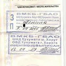 listen), plural: propiski)[1] was both a residency permit and a migration-recording tool, used in the Russian Empire before 1917 and in the Soviet Union from the 1930s.[2] Literally, the word propiska means "inscription", alluding to the inscription in a state internal passport permitting a person to reside in a given place. For a state-owned or third-party-owned property, having a propiska meant the inclusion of a person in the rental contract associated with a dwelling. A propiska was certified via local police (Militsiya) registers and stamped in this internal passports. Undocumented residence anywhere for longer than a few weeks was prohibited.