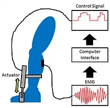 Robotic lower-limb exoskeletons can be controlled by several methods, including a footswitch (a pressure sensor attached to the bottom of the foot), gait-phase estimation (using joint angles to determine the current phase of walking), and myoelectric control (using electromyography).[2][3] This article focuses on myoelectric control.