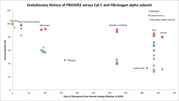 PROSER2 is a fast evolving gene, similar to Fibrinogen alpha subunit (FGA). It aligns almost perfectly with Fibrinogen’s evolutionary history and is much farther away from the evolutionary timeline of Cytochrome C (CYCS) which is evolving more slowly than PROSER2 or FGA. Gene duplication of PROSER2 occurred approximately in fish which diverged from humans 436.8 MYA.[8]