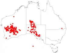 This mintbush grows on sandplains, granite outcrops, low sandy rises and dunes. Subspecies althoferi is restricted to Western Australia where it is found in the Avon Wheatbelt, Coolgardie, Great Victoria Desert, Murchison and Yalgoo biogeographic regions.[8] Subspecies longifolia occurs in the southern part of the Northern Territory and the northern arid and western pastoral regions and Eyre Peninsula in South Australia.[2][3][4]
