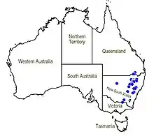 Granite mint bush grows in heath and forest in rocky places, mainly on the tablelands, slopes and plains of New South Wales.[2][5]