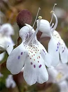 Prostanthera prostantheroides is a small shrub that typically grows to a height of up to 50 cm (20 in) and has stems that become spiny with age. The leaves are heart-shaped to round, 1–4 mm (0.039–0.157 in) long and about 1 mm (0.039 in) wide on a very short petiole. The flowers are arranged at the ends of the branches on pedicels 1–4 mm (0.039–0.157 in) long with bracteoles 3–4 mm (0.12–0.16 in) long at the base but that fall off as the flower develops. The sepals form a tube 3–3.5 mm (0.12–0.14 in) long with two lobes, the upper lobe about 3.5 mm (0.14 in) wide and the lower lobe about 3 mm (0.12 in) wide. The petals are 8–15 mm (0.31–0.59 in) long, white with purple, mauve to violet or red spots inside, and form a tube about 7 mm (0.28 in) long. The lower middle lobe is about 5 mm (0.20 in) wide and the side lobes are about 4 mm (0.16 in) long and 3 mm (0.12 in) wide, the upper lobes 3–3.5 mm (0.12–0.14 in) long and 2–2.5 mm (0.079–0.098 in) wide. Flowering occurs in August, September or October.[2][3]