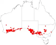 Prostanthera serpyllifolia occurs in New South Wales, Victoria, South Australia and Western Australia where it often grows in mallee communities, often on limestone or calcrete.[6] Subspecies microphylla occurs in New South Wales where it is found west from near West Wyalong. The same subspecies grows in the far north-west of Victoria, in the south east of South Australia, and along the southern part of Western Australia as far west as the southern Avon Wheatbelt. Subspecies serpyllifolia occurs on the Yorke and Eyre Peninsulas and there is a single record from the southwest of Western Australia.[2][5][6][13][14][15][16]