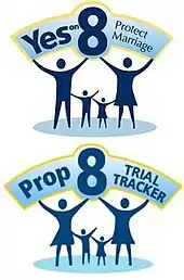 ProtectMarriage.com was a collection of conservative and religious American political activist groups aligned in opposition to same-sex marriage.[2][3] The coalition's stated goal is to "defend and restore the definition of marriage as between a man and a woman."[4] Beginning in 2001 as Proposition 22 Legal Defense and Education Fund holding the domain name protectmarriage.com, the organization reformed in 2005 as a coalition to sponsor California Proposition 8, called the California Marriage Protection Act,[5] and was successful in placing it on the ballot in 2008. Proposition 8 amended the California Constitution, putting a halt to same-sex marriages in California for nearly two years until the proposition was overturned as unconstitutional. While it was in effect, ProtectMarriage.com defended the amendment in a series of legal challenges. Ron Prentice is the executive director.[2]