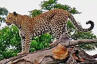 Predators include: the lion (Panthera leo), the largest predator of Africa (found in both parks); the leopard (Panthera pardus) a secretive large African cat (found even outside the two parks); the cheetah (Acinonyx jubatus) is in the national parks but is a rare sight; several (Felis silvestris), a smaller cat; the caracal (Caracal caracal), the African wild cat (Felis sylvestris); the African hunting dog (Lycaon pictus) said to be in W. Park (may be extinct); side-striped jackal (Canis adustus); the black-backed jackal (Canis mesomelas); the spotted hyena (Crocuta crocuta) found in both parks.[2]